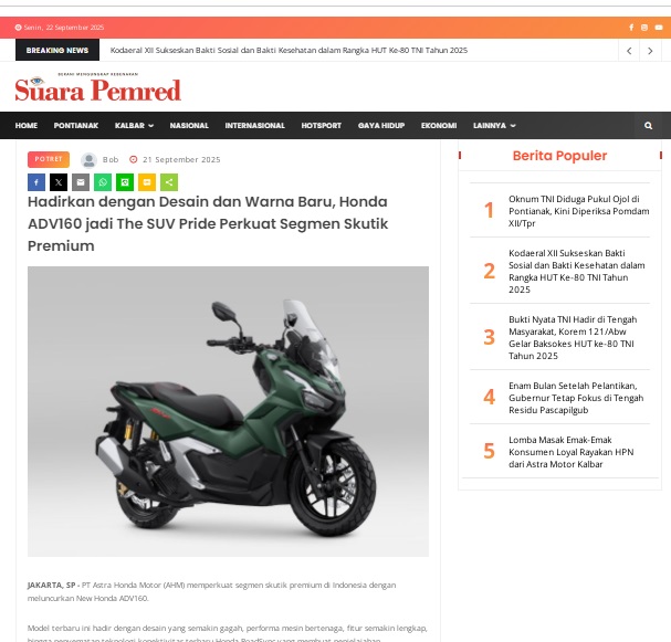 Hadirkan dengan Desain dan Warna Baru, Honda ADV160 jadi The SUV Pride Perkuat Segmen Skutik Premium by masmul 21 September 2025 in Silahkan kunjungi https://www.suarapemredkalbar.com/read/potret/21092025/hadirkan-dengan-desain-dan-warna-baru-honda-adv160-jadi-the-suv-pride-perkuat-segmen-skutik-premium. You Might Like Regional Public Launching New ADV160 The SUV Pride Grand Launching New PCX 160 Truly Exceptional! Tetap hati-hati ya bro sist berkendara saat hujan.