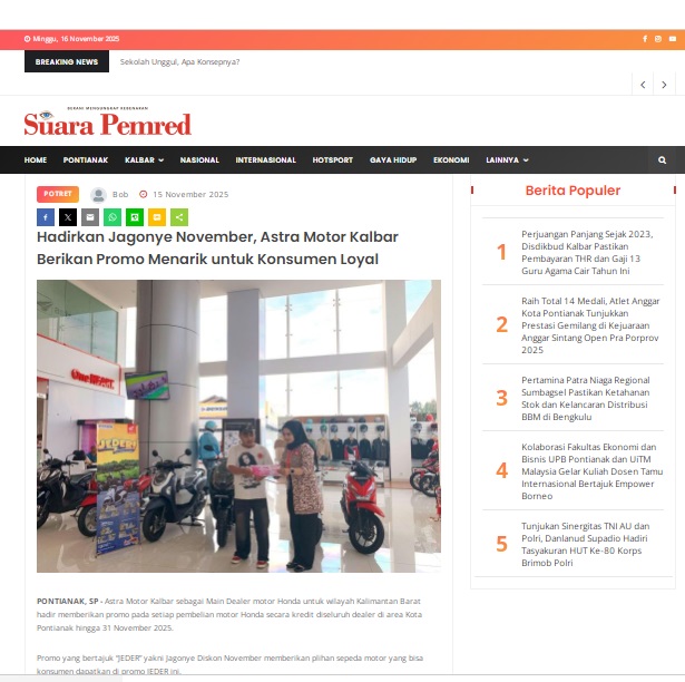 Hadirkan Jagonye November, Astra Motor Kalbar Berikan Promo Menarik untuk Konsumen Loyal by masmul 15 November 2025 in Silahkan kunjungi https://www.suarapemredkalbar.com/read/potret/15112025/hadirkan-jagonye-november-astra-motor-kalbar-berikan-promo-menarik-untuk-konsumen-loyal. You Might Like Regional Public Launching New ADV160 The SUV Pride Grand Launching New PCX 160 Truly Exceptional! Tetap hati-hati ya bro sist berkendara saat hujan.