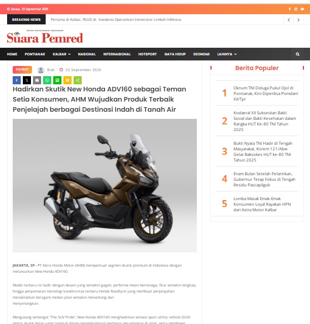 Hadirkan Skutik New Honda ADV160 sebagai Teman Setia Konsumen, AHM Wujudkan Produk Terbaik Penjelajah berbagai Destinasi Indah di Tanah Air by masmul 22 September 2025 in Silahkan kunjungi https://www.suarapemredkalbar.com/read/potret/22092025/hadirkan-skutik-new-honda-adv160-sebagai-teman-setia-konsumen-ahm-wujudkan-produk-terbaik-penjelajah-berbagai-destinasi-indah-di-tanah-air. You Might Like Regional Public Launching New ADV160 The SUV Pride Grand Launching New PCX 160 Truly Exceptional! Tetap hati-hati ya bro sist berkendara saat hujan.