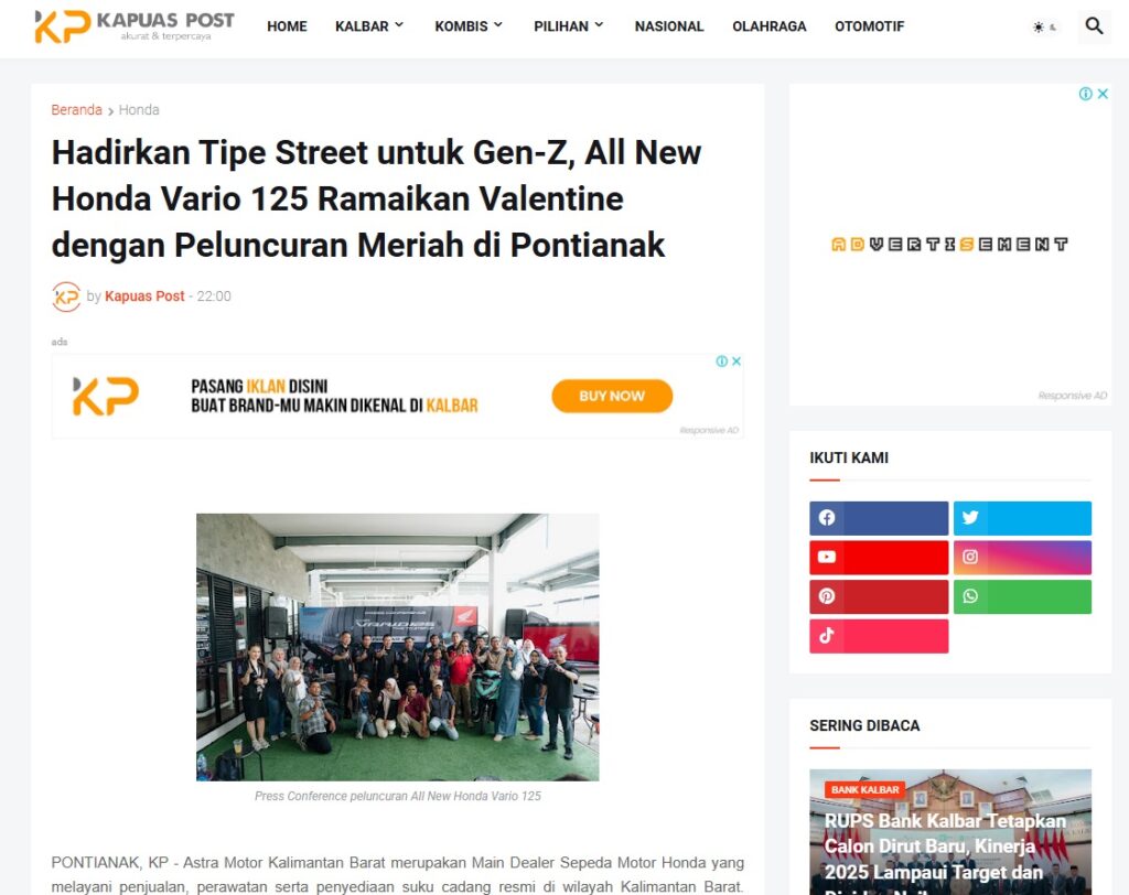 Hadirkan Tipe Street untuk Gen-Z, All New Honda Vario 125 Ramaikan Valentine dengan Peluncuran Meriah di Pontianak by Muhammad Arif 19 Februari 2026 in Silahkan kunjungi https://www.kapuaspost.web.id/2026/02/hadirkan-tipe-street-untuk-gen-z-all.html. Tags: astra Astra Motor kalbar Astra Motor Pontianak astramotor honda kalbar pontianak sepeda motor You Might Like Regional Public Launching New ADV160 The SUV Pride Grand Launching New PCX 160 Truly Exceptional! Tetap hati-hati ya bro sist berkendara saat hujan.