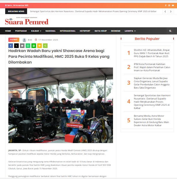 Hadirkan Wadah Baru yakni Showcase Arena bagi Para Pecinta Modifikasi, HMC 2025 Buka 9 Kelas yang Dilombakan by masmul 17 November 2025 in Silahkan kunjungi https://www.suarapemredkalbar.com/read/potret/17112025/hadirkan-wadah-baru-yakni-showcase-arena-bagi-para-pecinta-modifikasi-hmc-2025-buka-9-kelas-yang-dilombakan. You Might Like Regional Public Launching New ADV160 The SUV Pride Grand Launching New PCX 160 Truly Exceptional! Tetap hati-hati ya bro sist berkendara saat hujan.