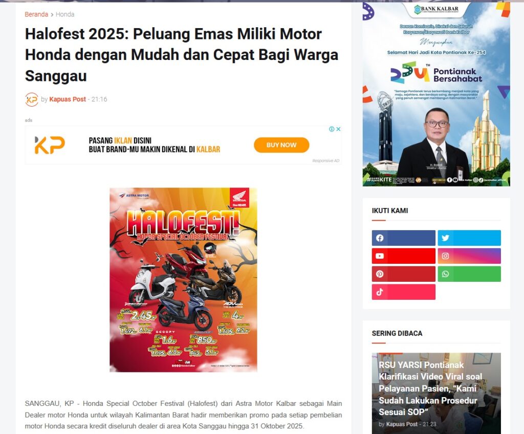 Halofest 2025: Peluang Emas Miliki Motor Honda dengan Mudah dan Cepat Bagi Warga Sanggau by Muhammad Arif 22 Oktober 2025 in Silahkan kunjungi https://www.kapuaspost.web.id/2025/10/halofest-2025-peluang-emas-miliki-motor.html. Tags: astra Astra Motor kalbar Astra Motor Pontianak astramotor honda kalbar pontianak sepeda motor You Might Like Regional Public Launching New ADV160 The SUV Pride Grand Launching New PCX 160 Truly Exceptional! Tetap hati-hati ya bro sist berkendara saat hujan.