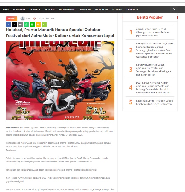 Halofest, Promo Menarik Honda Special October Festival dari Astra Motor Kalbar untuk Konsumen Loyal by masmul 22 Oktober 2025 in Silahkan kunjungi https://www.suarapemredkalbar.com/read/potret/22102025/halofest-promo-menarik-honda-special-october-festival-dari-astra-motor-kalbar-untuk-konsumen-loyal. You Might Like Regional Public Launching New ADV160 The SUV Pride Grand Launching New PCX 160 Truly Exceptional! Tetap hati-hati ya bro sist berkendara saat hujan.
