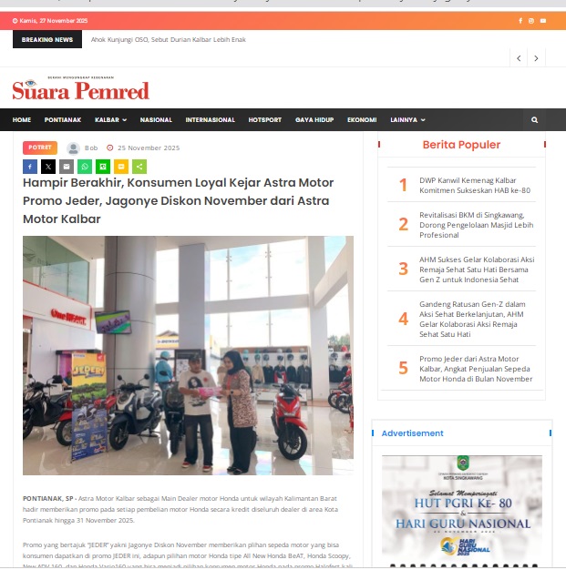 Hampir Berakhir, Konsumen Loyal Kejar Astra Motor Promo Jeder, Jagonye Diskon November dari Astra Motor Kalbar by masmul 25 November 2025 in Silahkan kunjungi https://www.suarapemredkalbar.com/read/potret/25112025/hampir-berakhir-konsumen-loyal-kejar-astra-motor-promo-jeder-jagonye-diskon-november-dari-astra-motor-kalbar. You Might Like Regional Public Launching New ADV160 The SUV Pride Grand Launching New PCX 160 Truly Exceptional! Tetap hati-hati ya bro sist berkendara saat hujan.