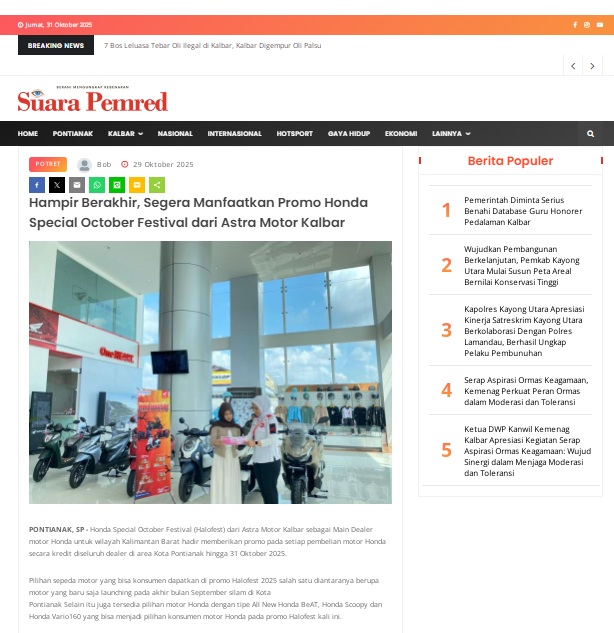 Hampir Berakhir, Segera Manfaatkan Promo Honda Special October Festival dari Astra Motor Kalbar by masmul 29 Oktober 2025 in Silahkan kunjungi https://www.suarapemredkalbar.com/read/potret/29102025/hampir-berakhir-segera-manfaatkan-promo-honda-special-october-festival-dari-astra-motor-kalbar. You Might Like Regional Public Launching New ADV160 The SUV Pride Grand Launching New PCX 160 Truly Exceptional! Tetap hati-hati ya bro sist berkendara saat hujan.