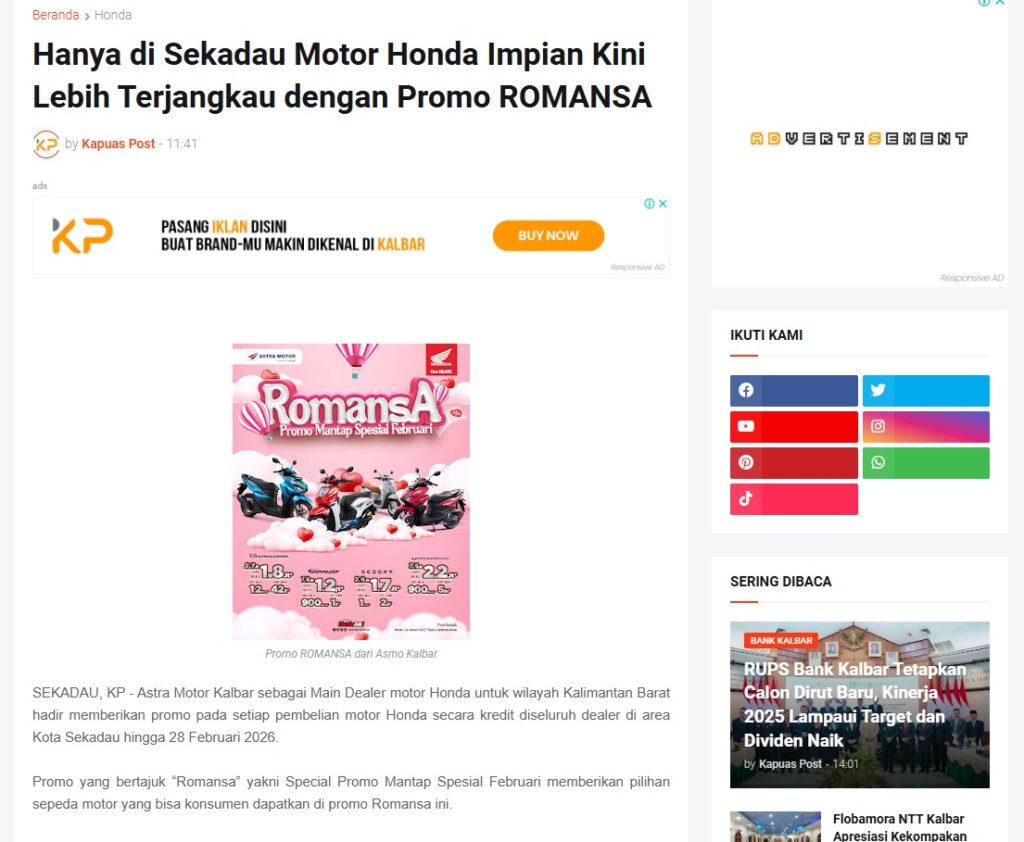 Hanya di Sekadau Motor Honda Impian Kini Lebih Terjangkau dengan Promo ROMANSA by Muhammad Arif 17 Februari 2026 in Silahkan kunjungi https://www.kapuaspost.web.id/2026/02/hanya-di-sekadau-motor-honda-impian.html. Tags: astra Astra Motor kalbar Astra Motor Pontianak astramotor honda kalbar pontianak sepeda motor You Might Like Regional Public Launching New ADV160 The SUV Pride Grand Launching New PCX 160 Truly Exceptional! Tetap hati-hati ya bro sist berkendara saat hujan.