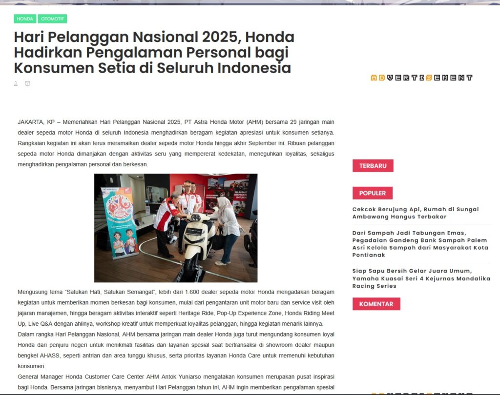 Hari Pelanggan Nasional 2025, Honda Hadirkan Pengalaman Personal bagi Konsumen Setia di Seluruh Indonesia by Muhammad Arif 22 September 2025 in Silahkan kunjungi https://www.kapuaspost.web.id/2025/09/hari-pelanggan-nasional-2025-honda.html. Tags: astra Astra Motor kalbar Astra Motor Pontianak astramotor honda kalbar pontianak sepeda motor You Might Like Regional Public Launching New ADV160 The SUV Pride Grand Launching New PCX 160 Truly Exceptional! Tetap hati-hati ya bro sist berkendara saat hujan.