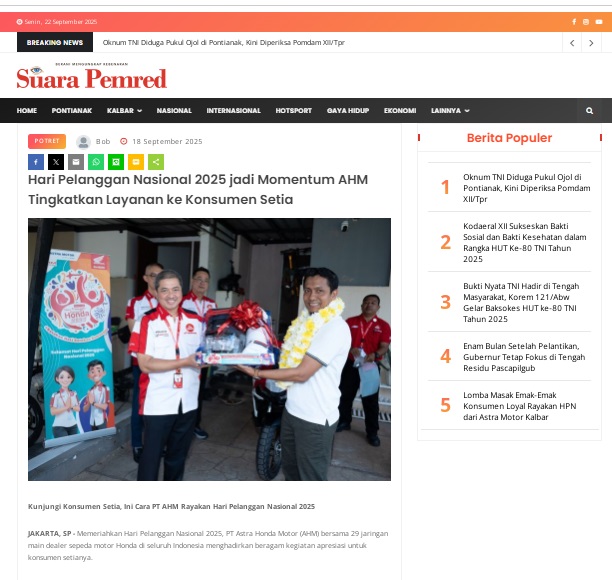 Hari Pelanggan Nasional 2025 jadi Momentum AHM Tingkatkan Layanan ke Konsumen Setia by masmul 18 September 2025 in Silahkan kunjungi https://www.suarapemredkalbar.com/read/potret/18092025/hari-pelanggan-nasional-2025-jadi-momentum-ahm-tingkatkan-layanan-ke-konsumen-setia. You Might Like Regional Public Launching New ADV160 The SUV Pride Grand Launching New PCX 160 Truly Exceptional! Tetap hati-hati ya bro sist berkendara saat hujan.