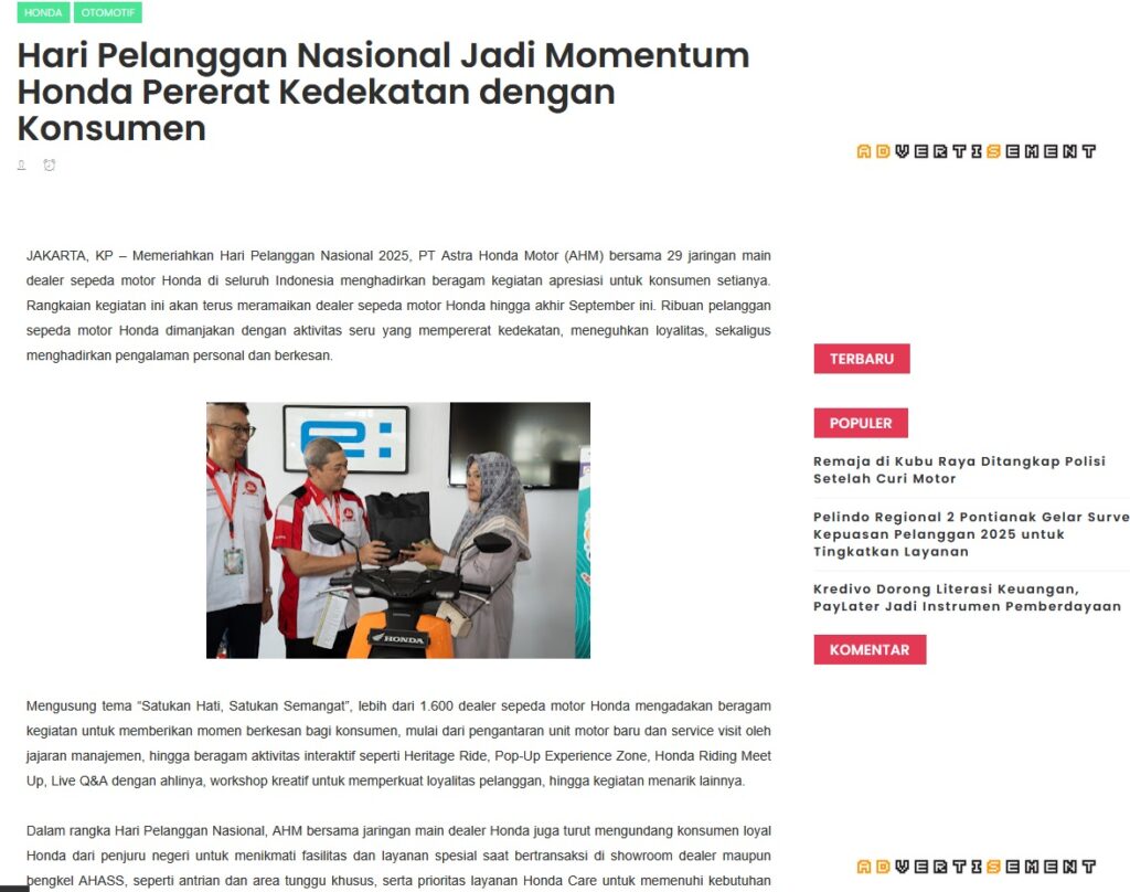 Hari Pelanggan Nasional Jadi Momentum Honda Pererat Kedekatan dengan Konsumen by Muhammad Arif 15 September 2025 in Silahkan kunjungi https://www.kapuaspost.web.id/2025/09/hari-pelanggan-nasional-jadi-momentum.html. Tags: astra Astra Motor kalbar Astra Motor Pontianak astramotor honda kalbar pontianak sepeda motor You Might Like Regional Public Launching New ADV160 The SUV Pride Grand Launching New PCX 160 Truly Exceptional! Tetap hati-hati ya bro sist berkendara saat hujan.