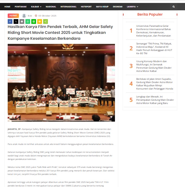 Hasilkan Karya Film Pendek Terbaik, AHM Gelar Safety Riding Short Movie Contest 2025 untuk Tingkatkan Kampanye Keselamatan Berkendara by masmul 3 Oktober 2025 in Silahkan kunjungi https://www.suarapemredkalbar.com/read/potret/03102025/hasilkan-karya-film-pendek-terbaik-ahm-gelar-safety-riding-short-movie-contest-2025-untuk-tingkatkan-kampanye-keselamatan-berkendara. You Might Like Regional Public Launching New ADV160 The SUV Pride Grand Launching New PCX 160 Truly Exceptional! Tetap hati-hati ya bro sist berkendara saat hujan.