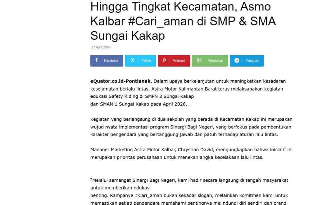 Hingga Tingkat Kecamatan, Asmo Kalbar #Cari_aman di SMP & SMA Sungai Kakap by Nova Sari 27 April 2026 in Silahkan kunjungi https://equator.co.id/hingga-tingkat-kecamatan-asmo-kalbar-cari_aman-di-smp-sma-sungai-kakap/. You Might Like Regional Public Launching New ADV160 The SUV Pride Grand Launching New PCX 160 Truly Exceptional! Tetap hati-hati ya bro sist berkendara saat hujan.