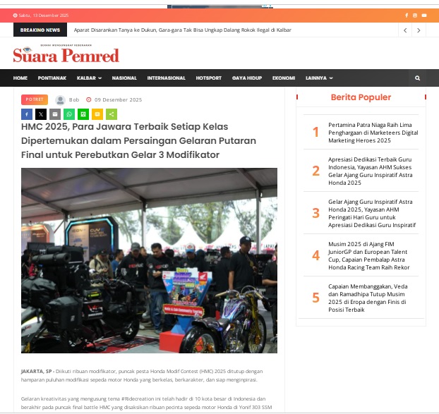 HMC 2025, Para Jawara Terbaik Setiap Kelas Dipertemukan dalam Persaingan Gelaran Putaran Final untuk Perebutkan Gelar 3 Modifikator by masmul 9 Desember 2025 in Silahkan kunjungi https://www.suarapemredkalbar.com/read/potret/09122025/hmc-2025-para-jawara-terbaik-setiap-kelas-dipertemukan-dalam-persaingan-gelaran-putaran-final-untuk-perebutkan-gelar-3-modifikator. You Might Like Regional Public Launching New ADV160 The SUV Pride Grand Launching New PCX 160 Truly Exceptional! Tetap hati-hati ya bro sist berkendara saat hujan.
