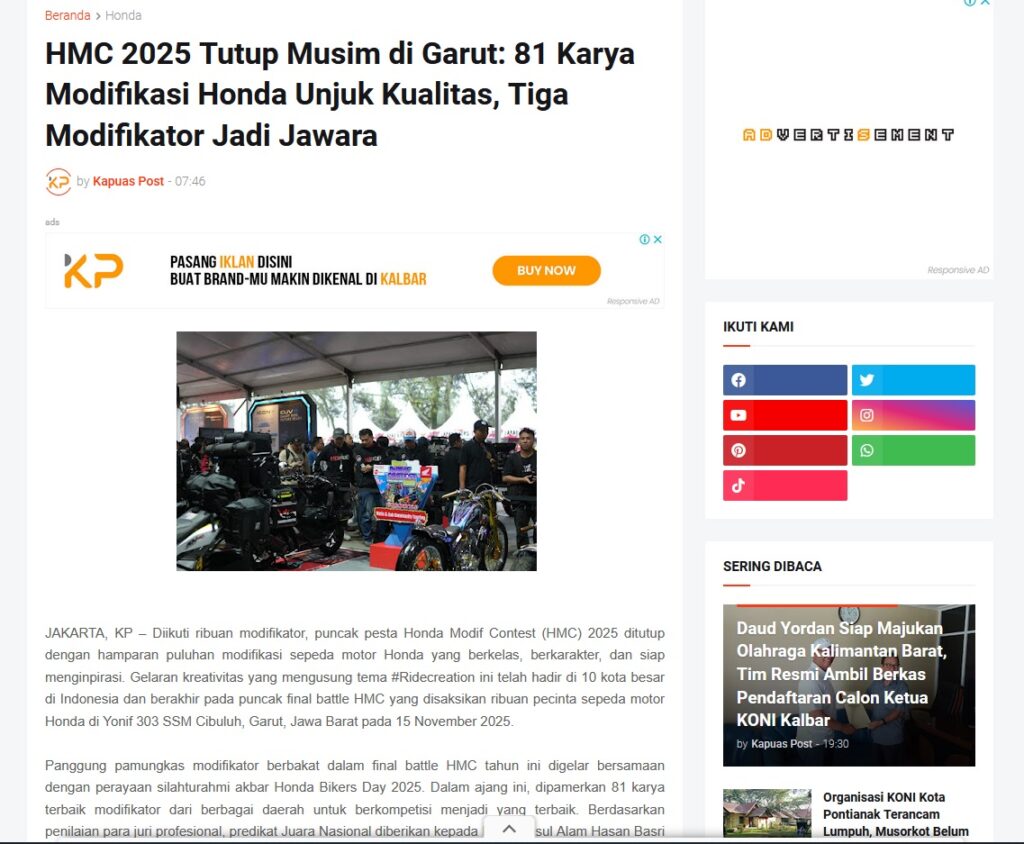 HMC 2025 Tutup Musim di Garut: 81 Karya Modifikasi Honda Unjuk Kualitas, Tiga Modifikator Jadi Jawara by Muhammad Arif 5 Desember 2025 in Silahkan kunjungi https://www.kapuaspost.web.id/2025/12/hmc-2025-tutup-musim-di-garut-81-karya.html. Tags: astra Astra Motor kalbar Astra Motor Pontianak astramotor honda kalbar pontianak sepeda motor You Might Like Regional Public Launching New ADV160 The SUV Pride Grand Launching New PCX 160 Truly Exceptional! Tetap hati-hati ya bro sist berkendara saat hujan.