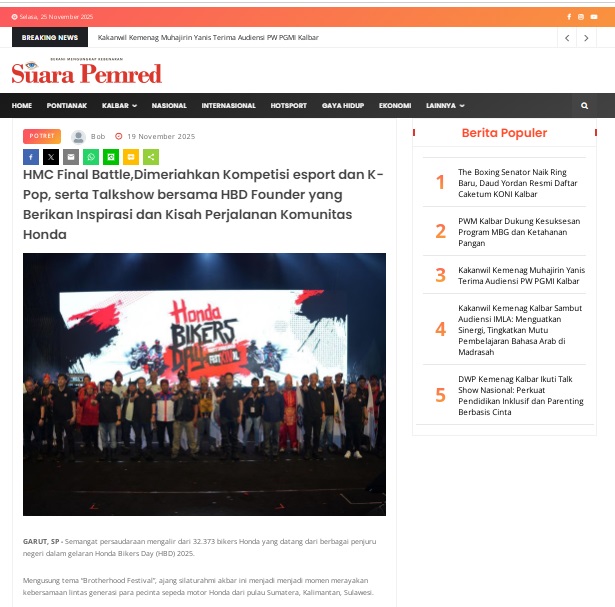 HMC Final Battle,Dimeriahkan Kompetisi esport dan K-Pop, serta Talkshow bersama HBD Founder yang Berikan Inspirasi dan Kisah Perjalanan Komunitas Honda by masmul 19 November 2025 in Silahkan kunjungi https://www.suarapemredkalbar.com/read/potret/19112025/hmc-final-battledimeriahkan-kompetisi-esport-dan-k-pop-serta-talkshow-bersama-hbd-founder-yang-berikan-inspirasi-dan-kisah-perjalanan-komunitas-honda. You Might Like Regional Public Launching New ADV160 The SUV Pride Grand Launching New PCX 160 Truly Exceptional! Tetap hati-hati ya bro sist berkendara saat hujan.