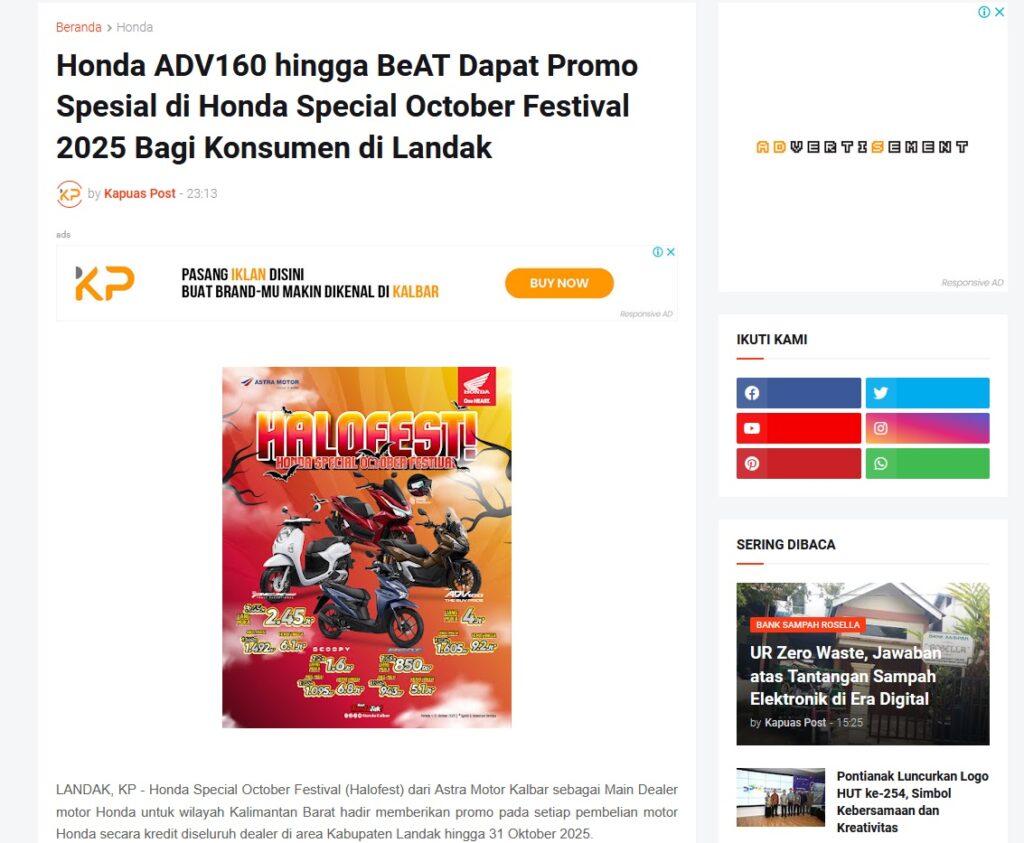 Honda ADV160 hingga BeAT Dapat Promo Spesial di Honda Special October Festival 2025 Bagi Konsumen di Landak by Muhammad Arif 18 Oktober 2025 in Silahkan kunjungi https://www.kapuaspost.web.id/2025/10/honda-adv160-hingga-beat-dapat-promo_19.html. Tags: astra Astra Motor kalbar Astra Motor Pontianak astramotor honda kalbar pontianak sepeda motor You Might Like Regional Public Launching New ADV160 The SUV Pride Grand Launching New PCX 160 Truly Exceptional! Tetap hati-hati ya bro sist berkendara saat hujan.