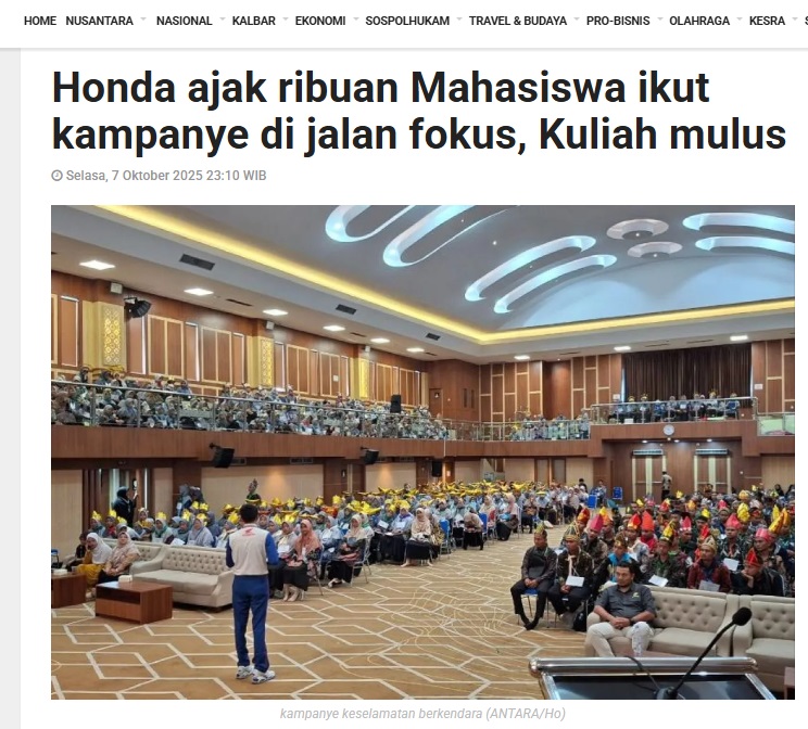 Honda ajak ribuan Mahasiswa ikut kampanye di jalan fokus, Kuliah mulus by Dedi 7 Oktober 2025 in Silahkan kunjungi https://kalbar.antaranews.com/berita/668845/honda-ajak-ribuan-mahasiswa-ikut-kampanye-di-jalan-fokus-kuliah-mulus. You Might Like Regional Public Launching New ADV160 The SUV Pride Grand Launching New PCX 160 Truly Exceptional! Tetap hati-hati ya bro sist berkendara saat hujan.
