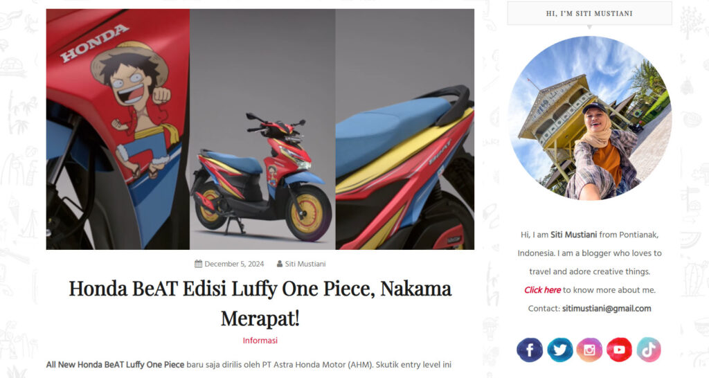 Honda BeAT Edisi Luffy One Piece, Nakama Merapat! by Siti Mustiani 4 Desember 2024 in Silahkan kunjungi https://sitimustiani.com/2024/12/honda-beat-edisi-luffy-one-piece-nakama-merapat/. Tags: All New Honda BeAT Luffy One Piece Astra Honda Motor Astra Motor Kalimantan Barat beat honda Beat One Piece Tahilalats Siti Mustiani http://www.sitimustiani.com Love to travel and adore creative things ✨ You Might Like Regional Public Launching New ADV160 The SUV Pride Grand Launching New PCX 160 Truly Exceptional! Tetap hati-hati ya bro sist berkendara saat hujan.