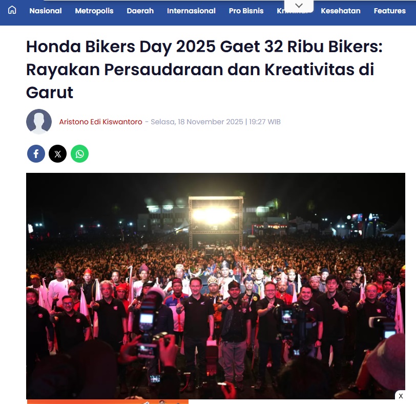 Honda Bikers Day 2025 Gaet 32 Ribu Bikers: Rayakan Persaudaraan dan Kreativitas di Garut by Aristono Edi Kiswantoro 18 November 2025 in Silahkan kunjungi https://pontianakpost.jawapos.com/otomotif/1466848734/honda-bikers-day-2025-gaet-32-ribu-bikers-rayakan-persaudaraan-dan-kreativitas-di-garut. You Might Like Regional Public Launching New ADV160 The SUV Pride Grand Launching New PCX 160 Truly Exceptional! Tetap hati-hati ya bro sist berkendara saat hujan.