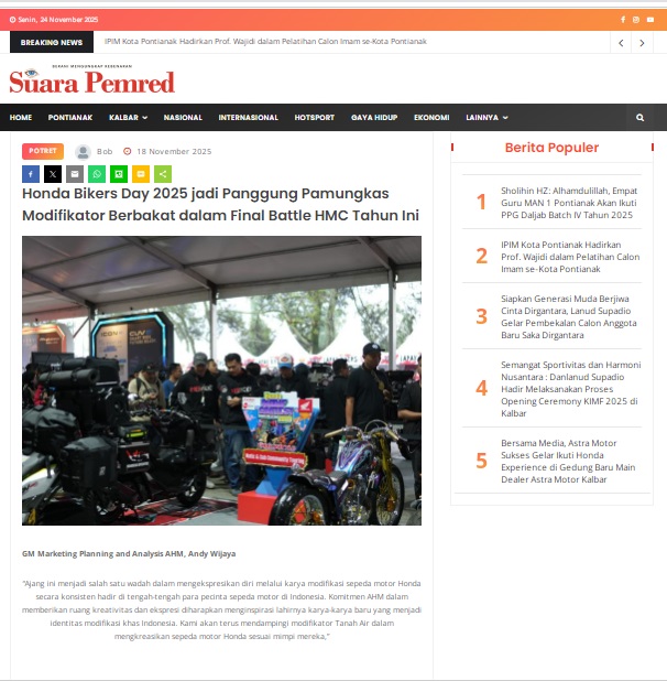 Honda Bikers Day 2025 jadi Panggung Pamungkas Modifikator Berbakat dalam Final Battle HMC Tahun Ini by masmul 18 November 2025 in Silahkan kunjungi https://www.suarapemredkalbar.com/read/potret/18112025/honda-bikers-day-2025-jadi-panggung-pamungkas-modifikator-berbakat-dalam-final-battle-hmc-tahun-ini. You Might Like Regional Public Launching New ADV160 The SUV Pride Grand Launching New PCX 160 Truly Exceptional! Tetap hati-hati ya bro sist berkendara saat hujan.