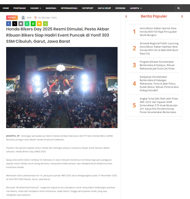 Honda Bikers Day 2025 Resmi Dimulai, Pesta Akbar Ribuan Bikers Siap Hadiri Event Puncak di Yonif 303 SSM Cibuluh, Garut, Jawa Barat by masmul 25 Oktober 2025 in Silahkan kunjungi https://www.suarapemredkalbar.com/read/potret/25102025/honda-bikers-day-2025-resmi-dimulai-pesta-akbar-ribuan-bikers-siap-hadiri-event-puncak-di-yonif-303-ssm-cibuluh-garut-jawa-barat. You Might Like Regional Public Launching New ADV160 The SUV Pride Grand Launching New PCX 160 Truly Exceptional! Tetap hati-hati ya bro sist berkendara saat hujan.