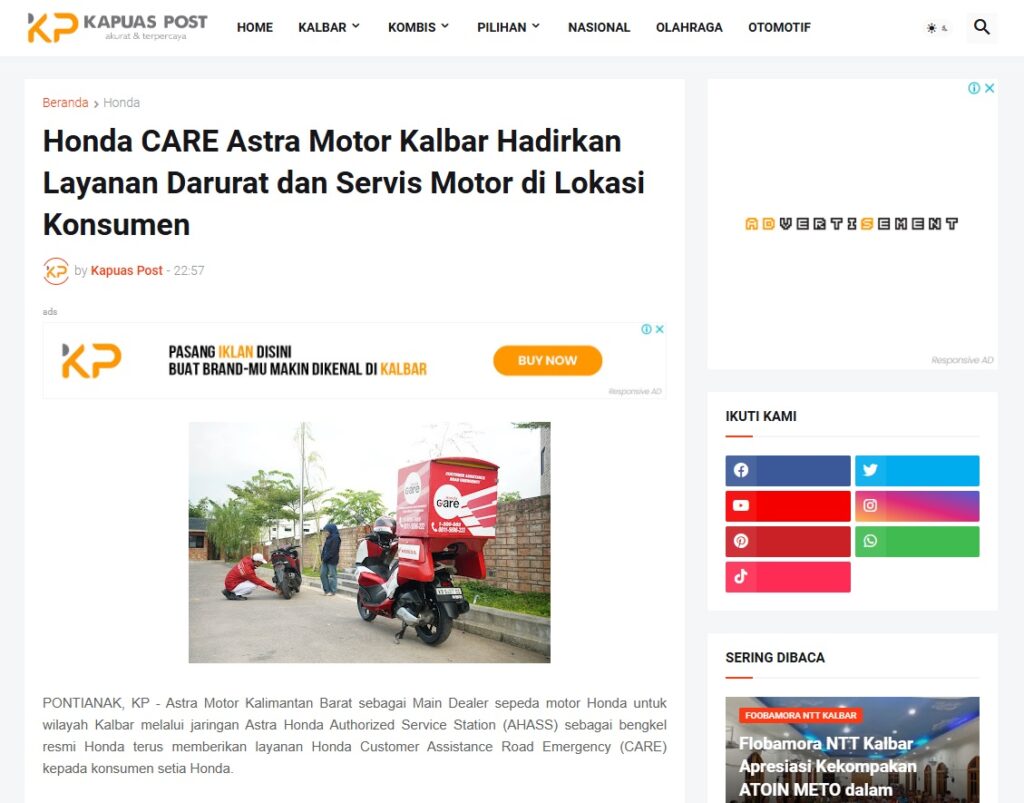 Honda CARE Astra Motor Kalbar Hadirkan Layanan Darurat dan Servis Motor di Lokasi Konsumen by Muhammad Arif 1 Februari 2026 in Silahkan kunjungi https://www.kapuaspost.web.id/2026/02/honda-care-astra-motor-kalbar-hadirkan.html. Tags: astra Astra Motor kalbar Astra Motor Pontianak astramotor honda kalbar pontianak sepeda motor You Might Like Regional Public Launching New ADV160 The SUV Pride Grand Launching New PCX 160 Truly Exceptional! Tetap hati-hati ya bro sist berkendara saat hujan.