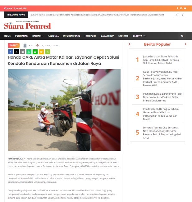 Honda CARE Astra Motor Kalbar, Layanan Cepat Solusi Kendala Kendaraan Konsumen di Jalan Raya by masmul 12 Januari 2026 in Silahkan kunjungi https://www.suarapemredkalbar.com/read/potret/12012026/honda-care-astra-motor-kalbar-layanan-cepat-solusi-kendala-kendaraan-konsumen-di-jalan-raya. You Might Like Regional Public Launching New ADV160 The SUV Pride Grand Launching New PCX 160 Truly Exceptional! Tetap hati-hati ya bro sist berkendara saat hujan.