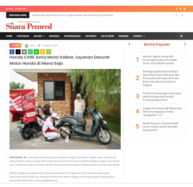 Honda CARE Astra Motor Kalbar, Layanan Darurat Motor Honda di Mana Saja by masmul 10 Maret 2026 in Silahkan kunjungi https://www.suarapemredkalbar.com/read/potret/10032026/honda-care-astra-motor-kalbar-layanan-darurat-motor-honda-di-mana-saja. You Might Like Regional Public Launching New ADV160 The SUV Pride Grand Launching New PCX 160 Truly Exceptional! Tetap hati-hati ya bro sist berkendara saat hujan.