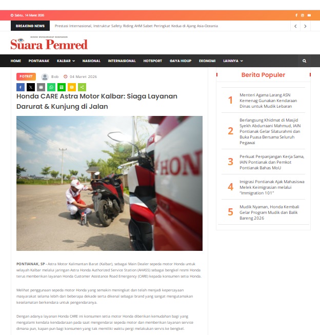 Honda CARE Astra Motor Kalbar: Siaga Layanan Darurat & Kunjung di Jalan by masmul 4 Maret 2026 in Silahkan kunjungi https://www.suarapemredkalbar.com/read/potret/04032026/honda-care-astra-motor-kalbar-siaga-layanan-darurat-kunjung-di-jalan. You Might Like Regional Public Launching New ADV160 The SUV Pride Grand Launching New PCX 160 Truly Exceptional! Tetap hati-hati ya bro sist berkendara saat hujan.