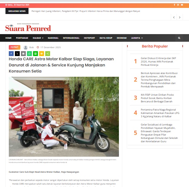 Honda CARE Astra Motor Kalbar Siap Siaga, Layanan Darurat di Jalanan & Service Kunjung Manjakan Konsumen Setia by masmul 17 Desember 2025 in Silahkan kunjungi https://www.suarapemredkalbar.com/read/potret/17122025/honda-care-astra-motor-kalbar-siap-siaga-layanan-darurat-di-jalanan-service-kunjung-manjakan-konsumen-setia. You Might Like Regional Public Launching New ADV160 The SUV Pride Grand Launching New PCX 160 Truly Exceptional! Tetap hati-hati ya bro sist berkendara saat hujan.