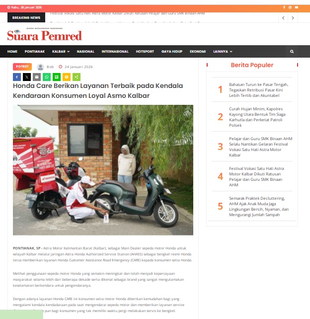 Honda Care Berikan Layanan Terbaik pada Kendala Kendaraan Konsumen Loyal Asmo Kalbar by masmul 24 Januari 2026 in Silahkan kunjungi https://www.suarapemredkalbar.com/read/potret/24012026/honda-care-berikan-layanan-terbaik-pada-kendala-kendaraan-konsumen-loyal-asmo-kalbar. You Might Like Regional Public Launching New ADV160 The SUV Pride Grand Launching New PCX 160 Truly Exceptional! Tetap hati-hati ya bro sist berkendara saat hujan.