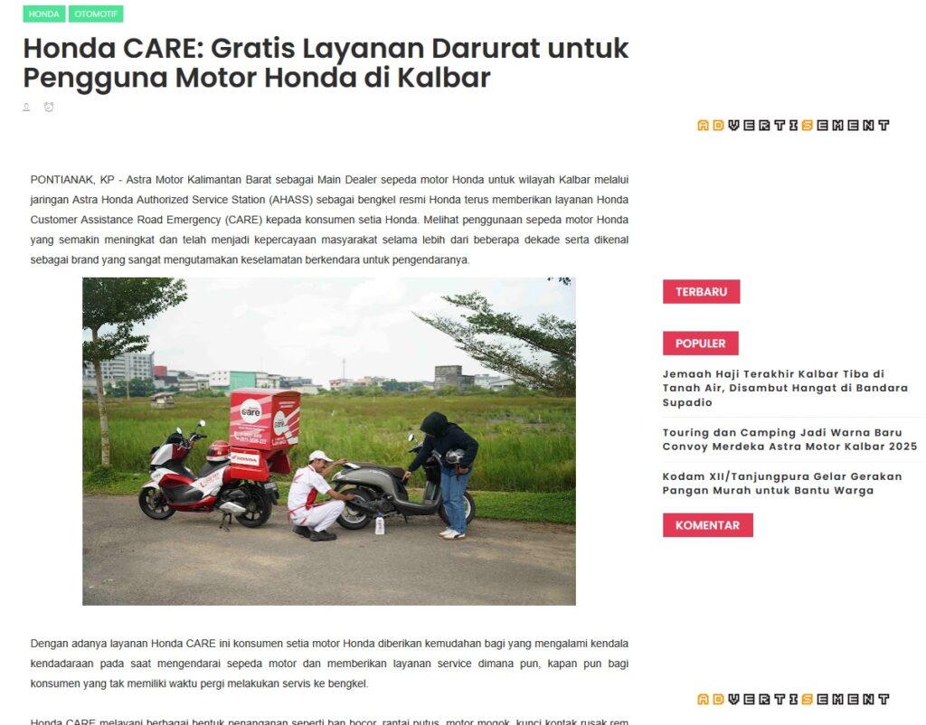 Honda CARE: Gratis Layanan Darurat untuk Pengguna Motor Honda di Kalbar by Muhammad Arif 1 September 2025 in Silahkan kunjungi https://www.kapuaspost.web.id/2025/09/honda-care-gratis-layanan-darurat-untuk.html. Tags: astra Astra Motor kalbar Astra Motor Pontianak astramotor honda kalbar pontianak sepeda motor You Might Like Regional Public Launching New ADV160 The SUV Pride Grand Launching New PCX 160 Truly Exceptional! Tetap hati-hati ya bro sist berkendara saat hujan.