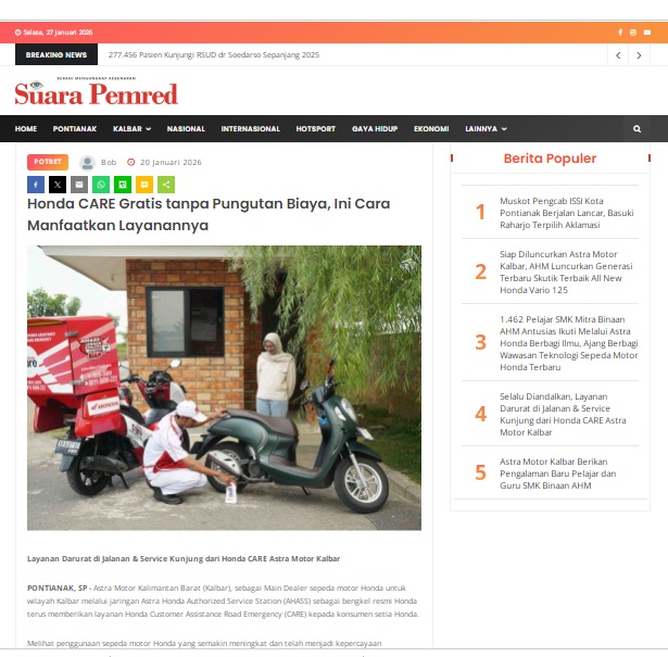 Honda CARE Gratis tanpa Pungutan Biaya, Ini Cara Manfaatkan Layanannya by masmul 20 Januari 2026 in Silahkan kunjungi https://www.suarapemredkalbar.com/read/potret/20012026/honda-care-gratis-tanpa-pungutan-biaya-ini-cara-manfaatkan-layanannya. You Might Like Regional Public Launching New ADV160 The SUV Pride Grand Launching New PCX 160 Truly Exceptional! Tetap hati-hati ya bro sist berkendara saat hujan.