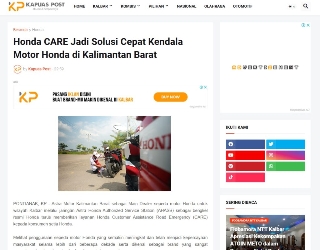 Honda CARE Jadi Solusi Cepat Kendala Motor Honda di Kalimantan Barat by Muhammad Arif 3 Februari 2026 in Silahkan kunjungi https://www.kapuaspost.web.id/2026/02/honda-care-jadi-solusi-cepat-kendala.html. Tags: astra Astra Motor kalbar Astra Motor Pontianak astramotor honda kalbar pontianak sepeda motor You Might Like Regional Public Launching New ADV160 The SUV Pride Grand Launching New PCX 160 Truly Exceptional! Tetap hati-hati ya bro sist berkendara saat hujan.