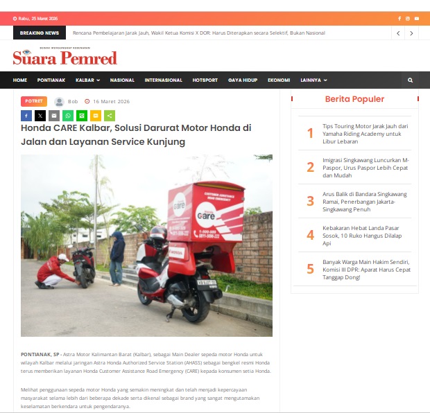 Honda CARE Kalbar, Solusi Darurat Motor Honda di Jalan dan Layanan Service Kunjung by masmul 16 Maret 2026 in Silahkan kunjungi https://www.suarapemredkalbar.com/read/potret/16032026/honda-care-kalbar-solusi-darurat-motor-honda-di-jalan-dan-layanan-service-kunjung. You Might Like Regional Public Launching New ADV160 The SUV Pride Grand Launching New PCX 160 Truly Exceptional! Tetap hati-hati ya bro sist berkendara saat hujan.