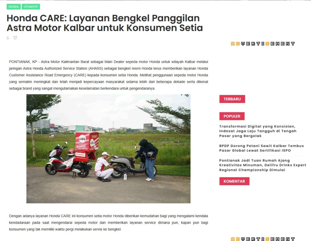 Honda CARE: Layanan Bengkel Panggilan Astra Motor Kalbar untuk Konsumen Setia by Muhammad Arif 20 Agustus 2025 in Silahkan kunjungi https://www.kapuaspost.web.id/2025/08/honda-care-layanan-bengkel-panggilan.html. Tags: astra Astra Motor kalbar Astra Motor Pontianak astramotor honda kalbar pontianak sepeda motor You Might Like Regional Public Launching New ADV160 The SUV Pride Grand Launching New PCX 160 Truly Exceptional! Tetap hati-hati ya bro sist berkendara saat hujan.