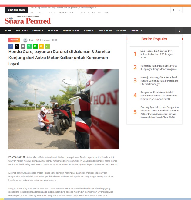 Honda Care, Layanan Darurat di Jalanan & Service Kunjung dari Astra Motor Kalbar untuk Konsumen Loyal by masmul 30 Januari 2026 in Silahkan kunjungi https://www.suarapemredkalbar.com/read/potret/30012026/honda-care-layanan-darurat-di-jalanan-service-kunjung-dari-astra-motor-kalbaruntuk-konsumen-loyal. You Might Like Regional Public Launching New ADV160 The SUV Pride Grand Launching New PCX 160 Truly Exceptional! Tetap hati-hati ya bro sist berkendara saat hujan.