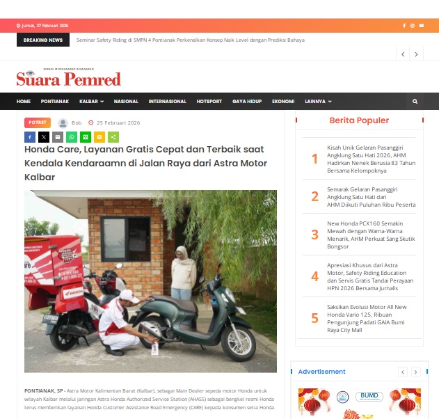 Honda Care, Layanan Gratis Cepat dan Terbaik saat Kendala Kendaraamn di Jalan Raya dari Astra Motor Kalbar by masmul 25 Februari 2026 in Silahkan kunjungi https://www.suarapemredkalbar.com/read/potret/25022026/honda-care-layanan-gratis-cepat-dan-terbaik-saat-kendala-kendaraamn-di-jalan-raya-dari-astra-motor-kalbar. You Might Like Regional Public Launching New ADV160 The SUV Pride Grand Launching New PCX 160 Truly Exceptional! Tetap hati-hati ya bro sist berkendara saat hujan.