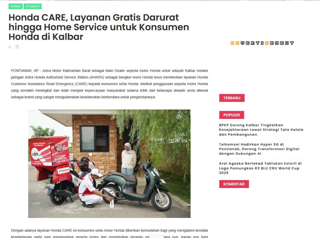 Honda CARE, Layanan Gratis Darurat hingga Home Service untuk Konsumen Honda di Kalbar