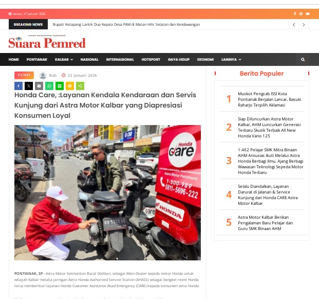 Honda Care, :Layanan Kendala Kendaraan dan Servis Kunjung dari Astra Motor Kalbar yang Diapresiasi Konsumen Loyal by masmul 22 Januari 2026 in Silahkan kunjungi https://www.suarapemredkalbar.com/read/potret/22012026/honda-care-layanan-kendala-kendaraan-dan-servis-kunjung-dari-astra-motor-kalbar-yang-diapresiasi-konsumen-loyal. You Might Like Regional Public Launching New ADV160 The SUV Pride Grand Launching New PCX 160 Truly Exceptional! Tetap hati-hati ya bro sist berkendara saat hujan.