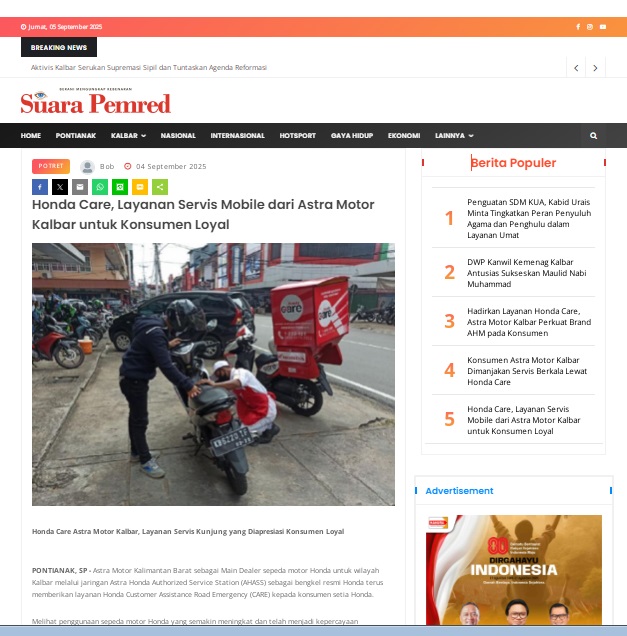 Honda Care, Layanan Servis Mobile dari Astra Motor Kalbar untuk Konsumen Loyal by masmul 4 September 2025 in Silahkan kunjungi https://www.suarapemredkalbar.com/read/potret/04092025/honda-care-layanan-servis-mobile-dari-astra-motor-kalbar-untuk-konsumen-loyal-1. You Might Like Regional Public Launching New ADV160 The SUV Pride Grand Launching New PCX 160 Truly Exceptional! Tetap hati-hati ya bro sist berkendara saat hujan.