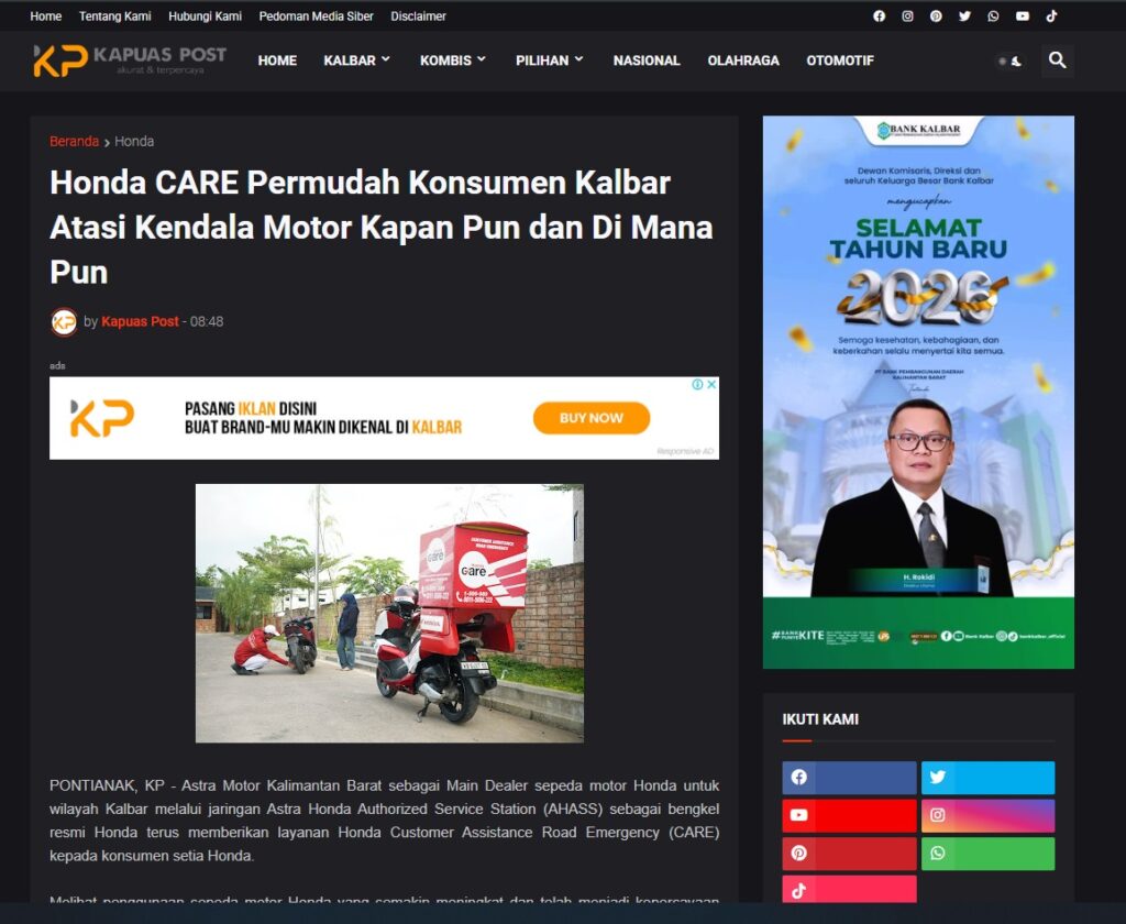 Honda CARE Permudah Konsumen Kalbar Atasi Kendala Motor Kapan Pun dan Di Mana Pun by Muhammad Arif 5 Januari 2026 in Silahkan kunjungi https://www.kapuaspost.web.id/2026/01/honda-care-permudah-konsumen-kalbar.html. Tags: astra Astra Motor kalbar Astra Motor Pontianak astramotor honda kalbar pontianak sepeda motor You Might Like Regional Public Launching New ADV160 The SUV Pride Grand Launching New PCX 160 Truly Exceptional! Tetap hati-hati ya bro sist berkendara saat hujan.
