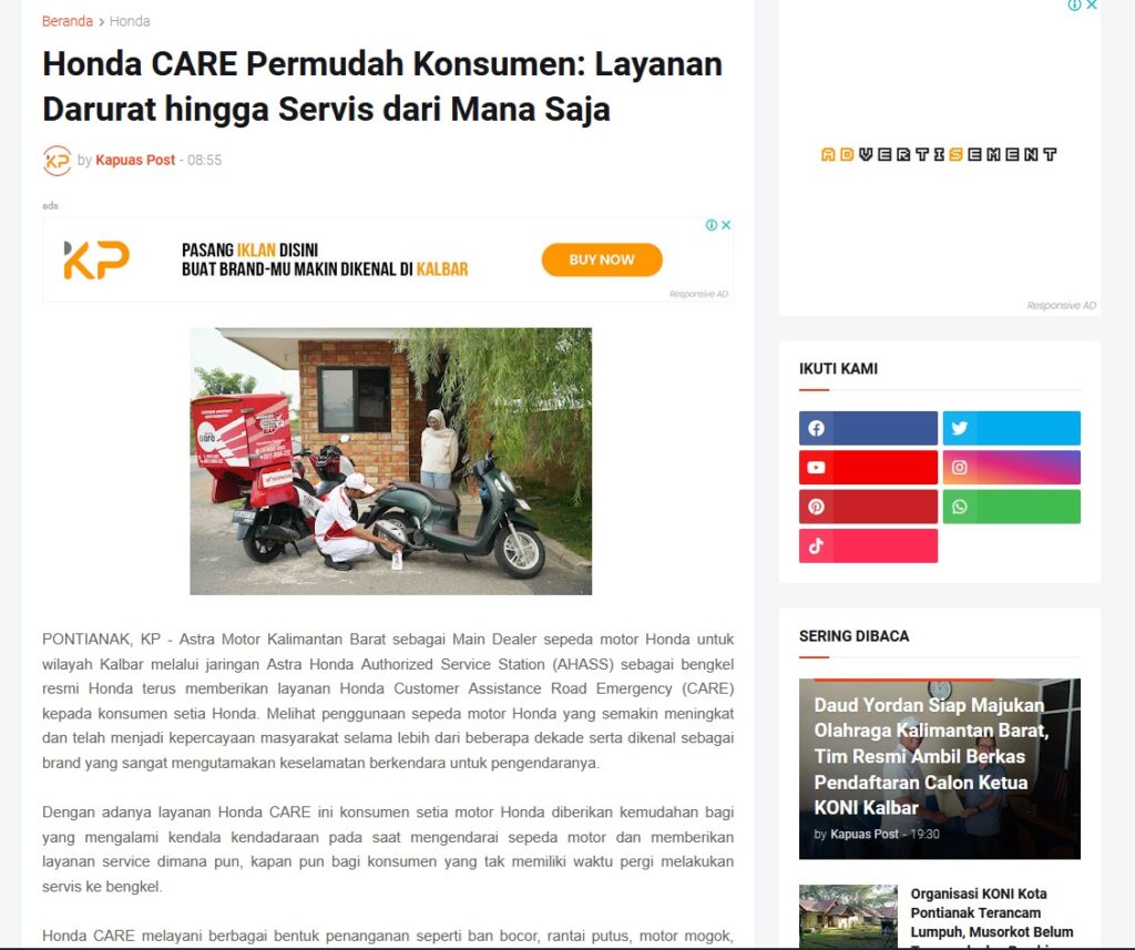 Honda CARE Permudah Konsumen: Layanan Darurat hingga Servis dari Mana Saja by Muhammad Arif 29 November 2025 in Silahkan kunjungi https://www.kapuaspost.web.id/2025/11/honda-care-permudah-konsumen-layanan.html. Tags: astra Astra Motor kalbar Astra Motor Pontianak astramotor honda kalbar pontianak sepeda motor You Might Like Regional Public Launching New ADV160 The SUV Pride Grand Launching New PCX 160 Truly Exceptional! Tetap hati-hati ya bro sist berkendara saat hujan.