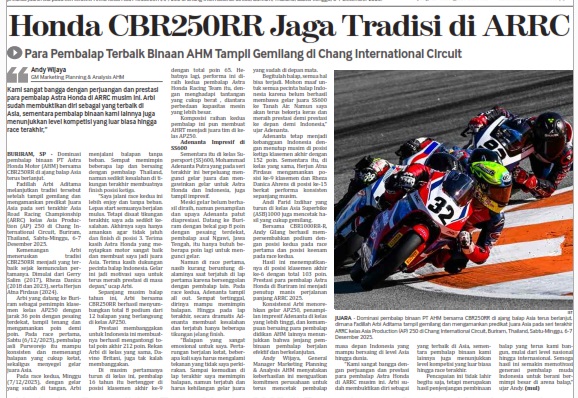 Honda CBR250RR Jaga Tradisi di ARRC, Para Pembalap Terbaik Binaan AHM Tampil Gemilang di Chang International Circuit by masmul 13 Desember 2025 in Silahkan buka . You Might Like Regional Public Launching New ADV160 The SUV Pride Grand Launching New PCX 160 Truly Exceptional! Tetap hati-hati ya bro sist berkendara saat hujan.