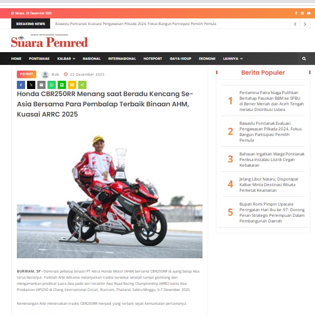 Honda CBR250RR Menang saat Beradu Kencang Se-Asia Bersama Para Pembalap Terbaik Binaan AHM, Kuasai ARRC 2025 by masmul 22 Desember 2025 in Silahkan kunjungi https://www.suarapemredkalbar.com/read/potret/22122025/honda-cbr250rr-menang-saat-beradu-kencang-se-asia-bersama-para-pembalap-terbaik-binaan-ahm-kuasai-arrc-2025. You Might Like Regional Public Launching New ADV160 The SUV Pride Grand Launching New PCX 160 Truly Exceptional! Tetap hati-hati ya bro sist berkendara saat hujan.