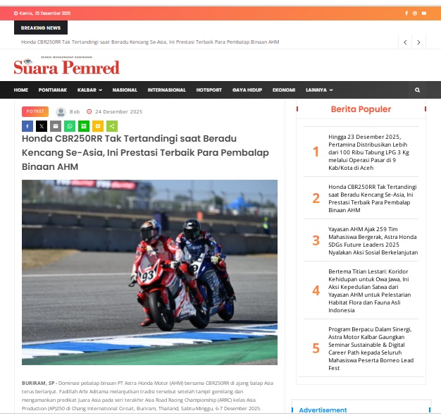 Honda CBR250RR Tak Tertandingi saat Beradu Kencang Se-Asia, Ini Prestasi Terbaik Para Pembalap Binaan AHM by masmul 24 Desember 2025 in Silahkan kunjungi https://www.suarapemredkalbar.com/read/potret/24122025/honda-cbr250rr-tak-tertandingi-saat-beradu-kencang-se-asia-ini-prestasi-terbaik-para-pembalap-binaan-ahm. You Might Like Regional Public Launching New ADV160 The SUV Pride Grand Launching New PCX 160 Truly Exceptional! Tetap hati-hati ya bro sist berkendara saat hujan.
