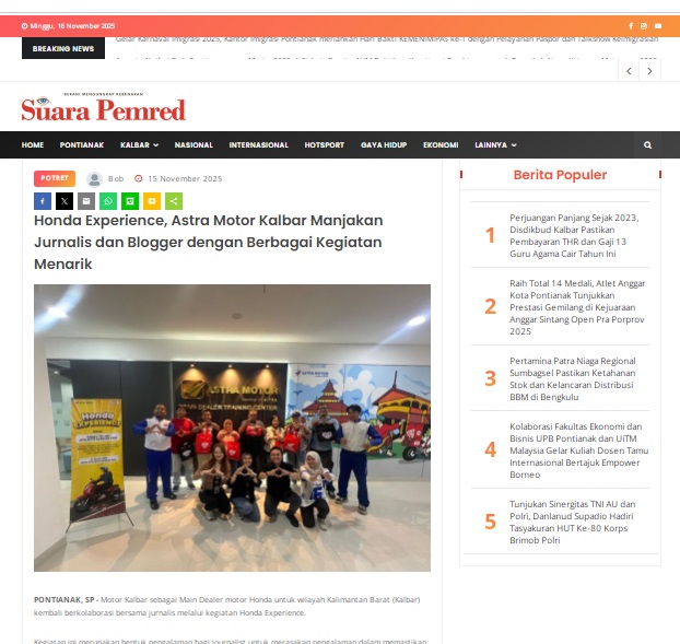 Honda Experience, Astra Motor Kalbar Manjakan Jurnalis dan Blogger dengan Berbagai Kegiatan Menarik by masmul 15 November 2025 in Silahkan kunjungi https://www.suarapemredkalbar.com/read/potret/15112025/honda-experience-astra-motor-kalbar-manjakan-jurnalis-dan-blogger-dengan-berbagai-kegiatan-menarik. You Might Like Regional Public Launching New ADV160 The SUV Pride Grand Launching New PCX 160 Truly Exceptional! Tetap hati-hati ya bro sist berkendara saat hujan.