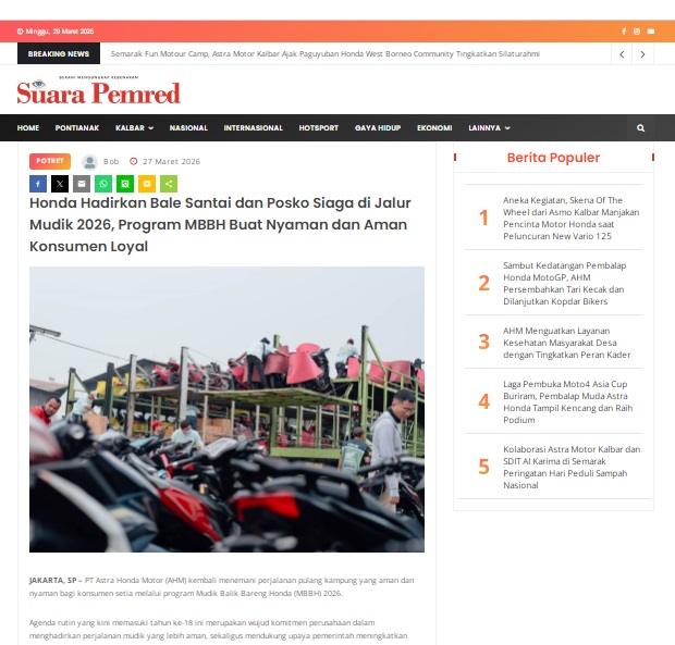 Honda Hadirkan Bale Santai dan Posko Siaga di Jalur Mudik 2026, Program MBBH Buat Nyaman dan Aman Konsumen Loyal by masmul 27 Maret 2026 in Silahkan kunjungi https://www.suarapemredkalbar.com/read/potret/27032026/honda-hadirkan-bale-santai-dan-posko-siaga-di-jalur-mudik-2026-program-mbbh-buat-nyaman-dan-aman-konsumen-loyal. You Might Like Regional Public Launching New ADV160 The SUV Pride Grand Launching New PCX 160 Truly Exceptional! Tetap hati-hati ya bro sist berkendara saat hujan.