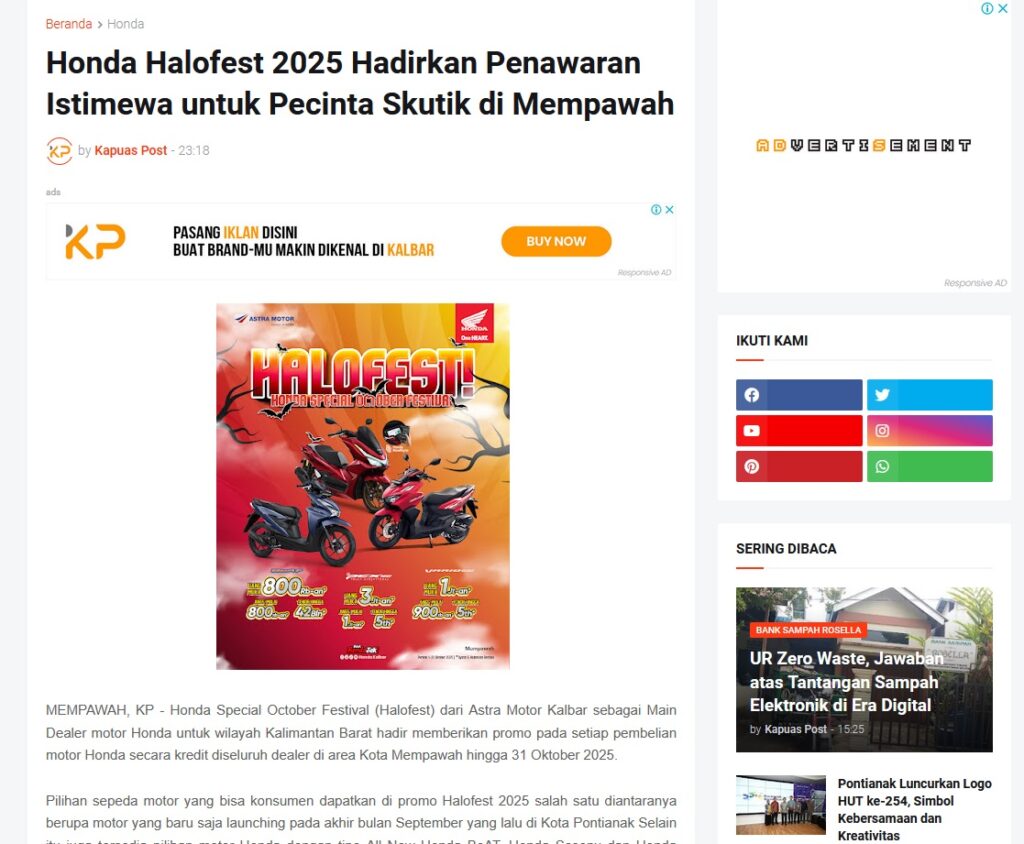 Honda Halofest 2025 Hadirkan Penawaran Istimewa untuk Pecinta Skutik di Mempawah by Muhammad Arif 17 Oktober 2025 in Silahkan kunjungi https://www.kapuaspost.web.id/2025/10/honda-halofest-2025-hadirkan-penawaran.html. Tags: astra Astra Motor kalbar Astra Motor Pontianak astramotor honda kalbar pontianak sepeda motor You Might Like Regional Public Launching New ADV160 The SUV Pride Grand Launching New PCX 160 Truly Exceptional! Tetap hati-hati ya bro sist berkendara saat hujan.