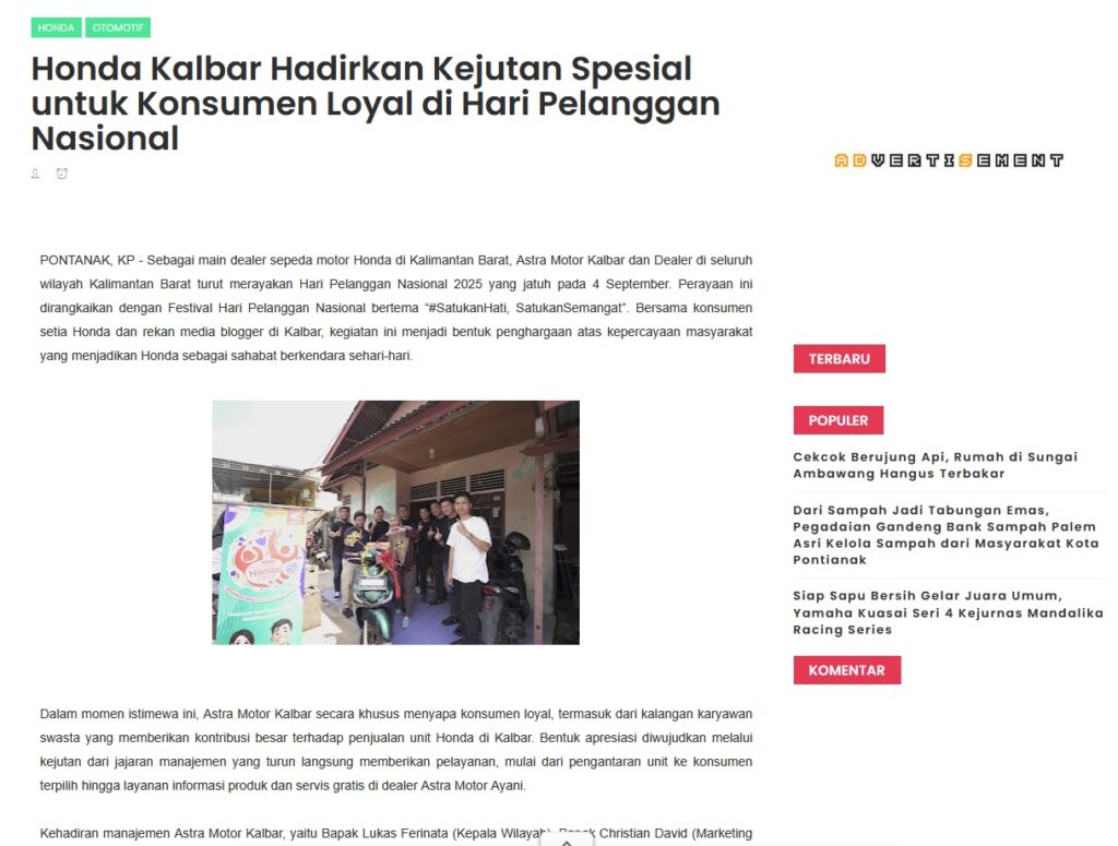 Honda Kalbar Hadirkan Kejutan Spesial untuk Konsumen Loyal di Hari Pelanggan Nasional by Muhammad Arif 22 September 2025 in Silahkan kunjungi https://www.kapuaspost.web.id/2025/09/honda-kalbar-hadirkan-kejutan-spesial.html. Tags: astra Astra Motor kalbar Astra Motor Pontianak astramotor honda kalbar pontianak sepeda motor You Might Like Regional Public Launching New ADV160 The SUV Pride Grand Launching New PCX 160 Truly Exceptional! Tetap hati-hati ya bro sist berkendara saat hujan.