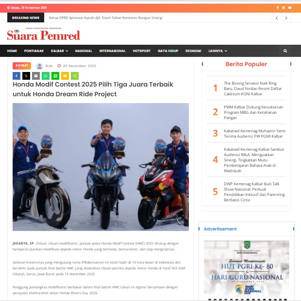 Honda Modif Contest 2025 Pilih Tiga Juara Terbaik untuk Honda Dream Ride Project by masmul 20 November 2025 in Silahkan kunjungi https://www.suarapemredkalbar.com/read/potret/20112025/honda-modif-contest-2025-pilih-tiga-juara-terbaik-untuk-honda-dream-ride-project. You Might Like Regional Public Launching New ADV160 The SUV Pride Grand Launching New PCX 160 Truly Exceptional! Tetap hati-hati ya bro sist berkendara saat hujan.